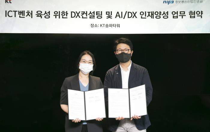 KT가 정보통신산업진흥원(NIPA)과 디지털전환(DX) 관련 사업 및 인공지능(AI)·DX 분야 인재 양성을 함께 추진하는 것을 주요 내용으로 한 업무협약(MOU)을 지난 5일 서울 송파구 KT 송파빌딩에서 맺었다고 8일 밝혔다. KT와