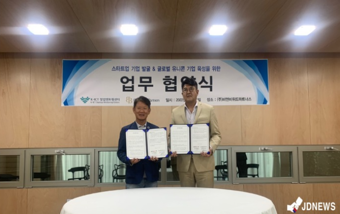사업 컨설팅 및 투자사인 (주)비앤비위드파트너스가 지난 23일 한국 청년 기업가 정신재단 K-ICT 창업 멘토링센터와 창업기업 발굴·육성을 목적으로 업무 협약을 체결했다.이날 협약식에는 (주)비앤비위드파트너스 홍정한 대표, 한국청년기업가정신재단 K-ICT 창업멘토링센