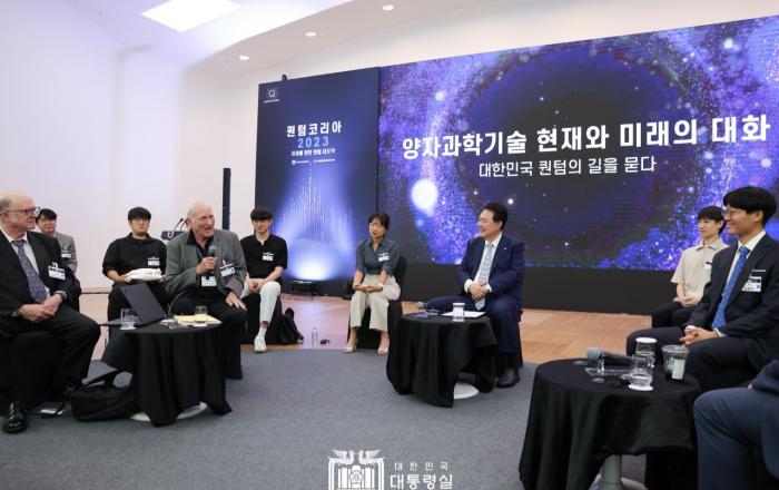윤석열 대통령은 27일 “세계 곳곳에 흩어져 있는 우리 퀀텀 과학과 기술의 역량을 집중해서 창의적인 시너지가 나올 수 있도록 퀀텀 연구자들의 플랫폼을 만들고자 한다”고 말했다. 윤 대통령은 이날 서울 동대문디자인플라자(DDP)에서 ‘퀀텀코리아 2023’을 계기로 열