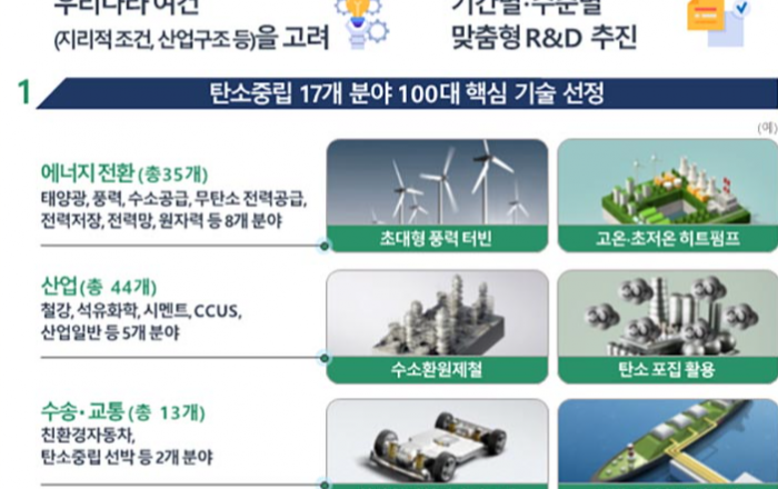 정부가 에너지 전환, 산업, 수송·교통, 건물·환경 부문과 관련된 17개 중점 분야를 대상으로 ‘한국형 탄소중립 100대 핵심기술’을 확정하고 본격적인 탄소중립 기술개발의 청사진을 제시했다. 또 석유화학, 철강, 시멘트 분야 ‘탄소중립 기술혁신 전략 로드맵’을