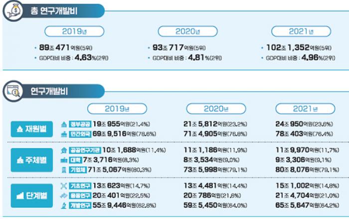 지난해 우리나라의 총 연구개발비는 102조 1352억원으로, 전년 대비 9.7% 증가하면서 처음으로 100조원 시대를 열었다. 또 국내 총생산(GDP) 대비 연구개발 비중은 4.96%로 이스라엘에 이어 세계 2위였고, 인구 1000명당 연구원 수는 9.1명으로 세