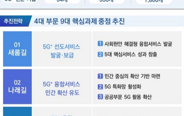 정부는 앞으로 세계 최초 5G를 넘어 세계 최고 5G+ 강국으로 도약하기 위해 융합 신서비스의 ‘새롬길’과 실증+민간 확산의 ‘나래길’을 만들고, 함께 성장하는 ‘보듬길’과 해외까지 개척하는 ‘누리길’을 동시에 추진하기로 했다.과학기술정보통신부는 18일 제5차 5G+
