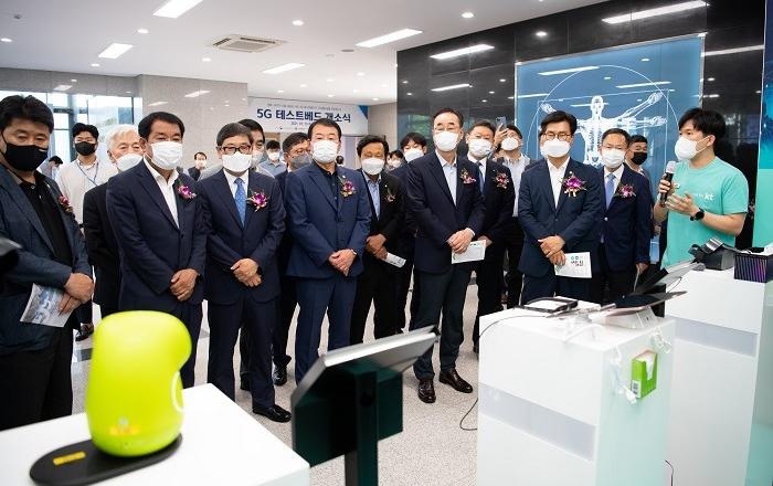 KT는 13일 오후 경상북도 구미시 금오테크노벨리에서 개최된 구미전자정보기술원의 ‘5G 테스트베드’ 개소식에서 5G 기지국 장비와 함께 AI서빙로봇, 반려로봇, VR/AR 글래스 등과 같은 5G 기반 서비스들을 선보였다고 밝혔다.구미전자정보기술원의 ‘5G