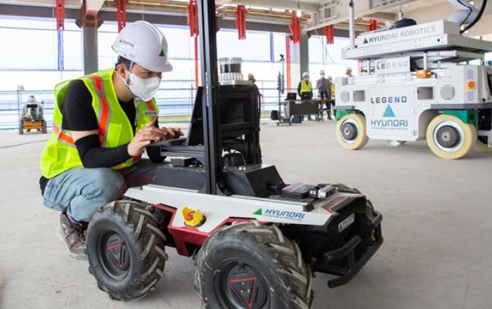 현대건설이 22일 경기도 성남시 소재 ‘현대중공업 글로벌R&D센터’ 현장에서 건설로보틱스 기술 시연회를 선보였다.이 행사에는 현대건설 기술연구원과 현장 관계자는 물론 현대로보틱스 등 스마트건설 전문가, 로봇산업 관계자 등 약 30여명이 참석한 가운데, 원격제어를