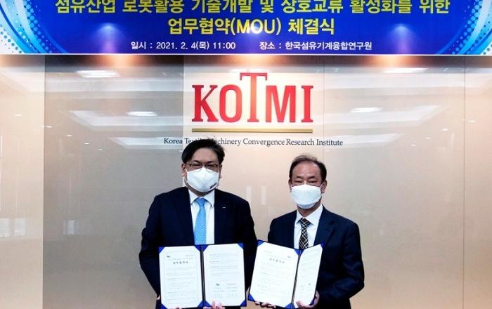 두산로보틱스가 한국섬유기계융합연구원(이하 KOTMI)과 ‘협동로봇을 활용한 섬유제조공정 자동화 기술개발’을 위한 업무협약(MOU)을 체결했다고 4일 밝혔다.경북 경산시 KOTMI 본원에서 열린 이날 협약식에는 KOTMI 성하경 원장, 두산로보틱스 최동휘 대표 등이 참석