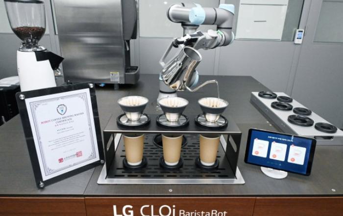 LG전자 ‘LG 클로이 바리스타봇(LG CLOi BaristaBot)’이 한국커피협회로부터 국내 최초로 ‘로봇 브루잉 마스터’ 자격증을 획득했다. 18일 서울 강서구 LG사이언스파크에서 LG전자 로봇사업 담당 노규찬 상무, 한국커피협회 이상규 협회장이 참석한 가운데 ‘