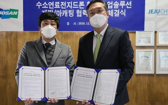 두산모빌리티이노베이션(이하 DMI)은 농업회사법인제주천지(이하 제주천지)와 ‘수소연료전지드론을 활용한 농업 솔루션 개발’을 위한 업무협약(MOU)을 체결했다고 22일 밝혔다. 제주천지는 드론과 무인헬기를 활용해 농림업 분야에서 영상분석과 재배 정보를 제공하는 기술전문회