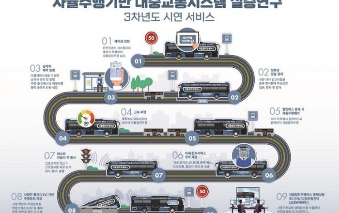 국토교통부가 2일 자율협력주행버스 실증 시연을 통해 차량통행이 적은 도로에서 중소형 버스로 시연했던 작년과 달리 실제 버스가 운행하는 노선을 따라 대형 버스를 운행, 더욱 발전된 기술 성과를 선보였다.국토부는 이날 일반 버스가 오가는 실제 도로 상황에서 자율협력주행 기