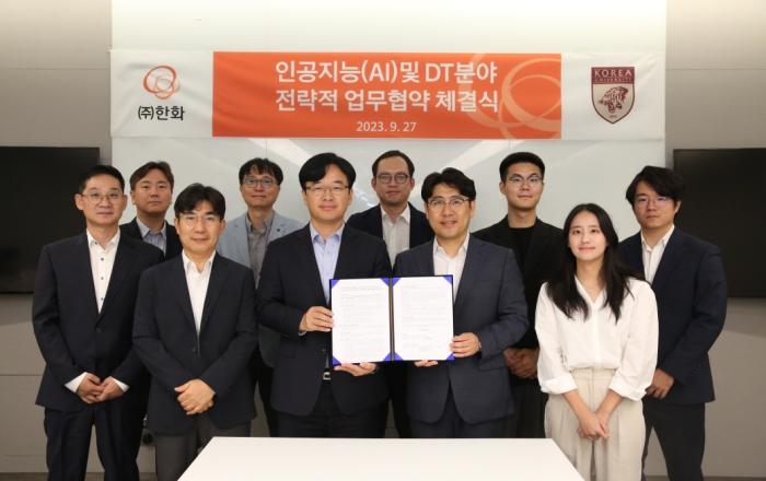 ㈜한화는 고려대학교와 9월 27일 서울 중구 한화빌딩에서 인공지능(AI) 분야 산학협력을 위한 전략적 업무협약을 체결했다. 이 자리에는 ㈜한화 정해진 DT담당, 고려대학교 산업경영공학과 김성범 교수 및 관계자들이 참석했으며, 협력 범위 및 방식에 대한 논의를 나누고 협