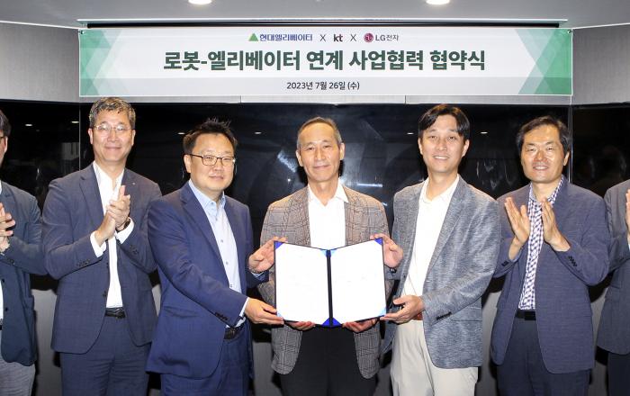 KT(www.kt.com)가 현대엘리베이터, 엘지전자와 함께 서울 종로구에 위치한 현대그룹빌딩 비전스튜디오에서 ‘로봇-승강기 연계 사업 협력 MOU’를 체결했다고 27일 밝혔다. 이번 협약식에는 이상호 KT AI 로봇사업단장, 도익한 현대엘리베이터