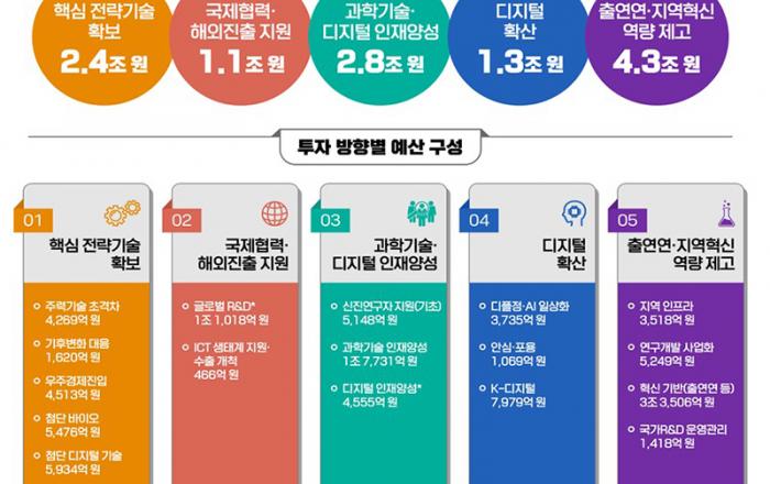과학기술정보통신부는 내년에 글로벌 선도를 위한 혁신적 R&D와 디지털 확산에 집중하기로 했다. 이에 세계 초일류 경쟁력과 차세대 성장동력을 확보하는 것을 목적으로 전략기술·국제협력·인재양성·디지털확산·출연연지역 등 5대 분야에 중점 투자할 방침이다. 과기정