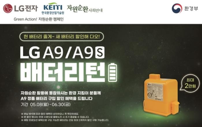 LG전자가 무선청소기 폐배터리의 자원순환에 앞장서며 ESG(환경, 사회, 지배구조) 경영을 실천한다. LG전자는 8일부터 오는 6월 30일까지 프리미엄 무선청소기 코드제로 A9과 A9S에 사용했던 폐배터리를 수거해 고객이 자원순환에 참여할 수 있도록 하고 새 배터리