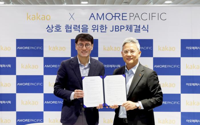 아모레퍼시픽이 카카오와 비즈니스 동반 성장을 위한 업무협약(JBP)을 체결했다. 양사는 8일 오전 용산 아모레퍼시픽 본사에서 협약식을 진행했다. 이날 협약식에서 아모레퍼시픽 김승환 대표와 카카오 홍은