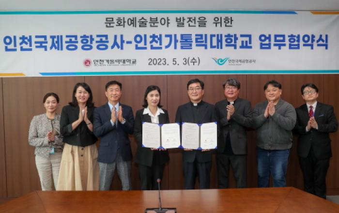 인천국제공항공사는 3일 공사 회의실에서 인천가톨릭대학교와 '문화예술분야 발전 및 교류 확대를 위한 업무협약'을 체결했다고 밝혔다. 이날 협약식에는 인천국제공항공사 이희정 사장 직무대행, 인천가톨릭대학교 송태일 총장을 포함한 양 기관 관계자 10여 명이 참석해 협약서