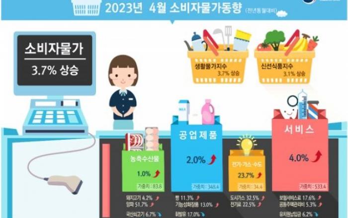 4월 소비자물가 상승률이 지난해 2월 이후 14개월 만에 3%대로 하락했다. 서비스 물가는 올랐지만 석유류 가격이 16.4% 내려 2020년 5월 이후 가장 큰 폭으로 하락하면서 전체 물가를 끌어내렸다. 2일 통계청이 발표한 2023년 4월 소비자물가동향에 따르면