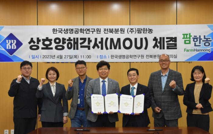 팜한농이 지난 27일 한국생명공학연구원 전북분원과 기술 협력 및 공동 연구 협약(MOU)을 체결했다. 전북 정읍의 한국생명공학연구원 전북분원에서 열린 이날 협약식에는 김무용 팜한농 대표와 김차영 한국생명공학연구원 전북분원장 등 주요 관계자 10여 명이 참