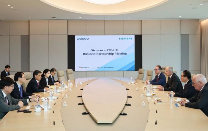 포스코 김학동 대표이사 부회장이 지난 25일 서울 포스코센터에서 독일 지멘스(Siemens)그룹 롤랜드 부시(Roland Busch) 회장과 만나 면담을 나눴다. 이번 면담은 포스코와 지멘스의 상호 협력관계를 강화하고 새로운 사업 기회를 모색하기 위해 마련된 자리로
