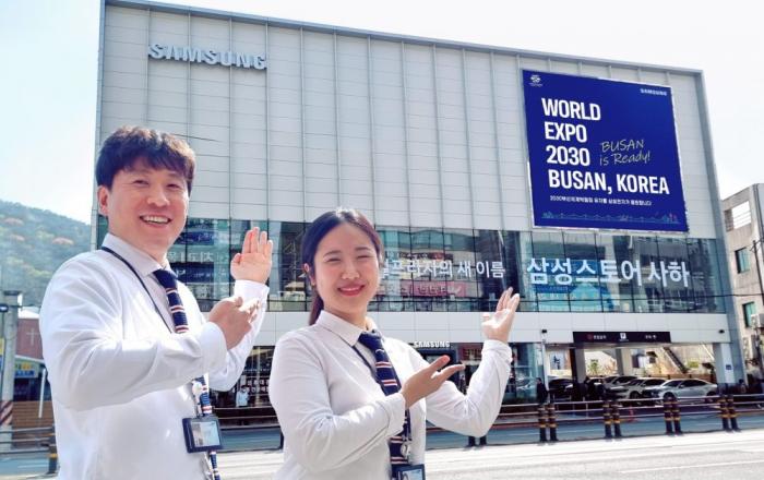 삼성전자가 국제박람회기구(BIE) 실사단의 방한을 맞아 부산에서 ‘2030 부산세계박람회(엑스포)’ 유치를 응원하는 광고를 진행한다. 삼성전자는 10일까지 부산광역시 광안, 구포, 대연, 동래, 사하, 센텀, 해운대 등 7개 삼성스토어에서 ‘2030 부산세계박람회
