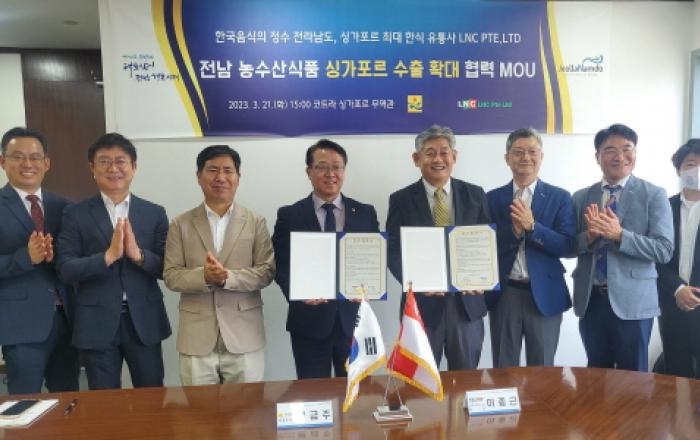 전라남도가 21일(현지 시각) 싱가포르에서 한국 식품 유통·판매 전문기업인 LNC와 전남 농수산식품 수출 확대 업무협약을 하는 등 남도음식 세계화에 박차를 가하고 있다. 협약식에선 문금주 전남도 행정부지사와 이종근 대표 등이 참석한 가운데 전남산 우수 농수산식품을
