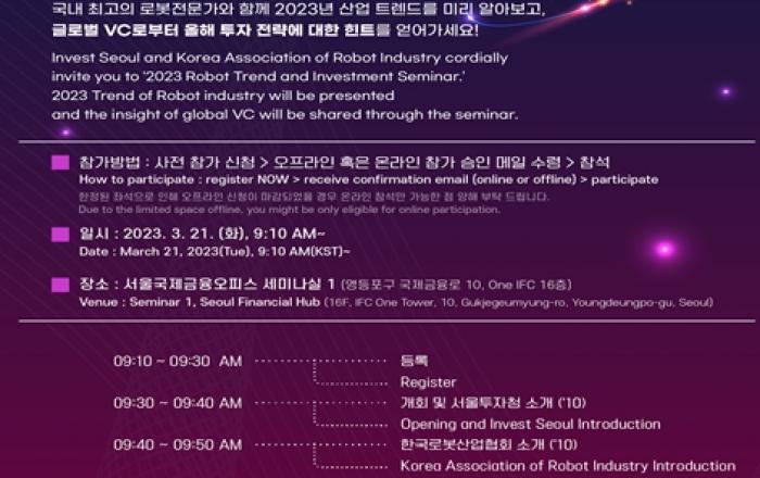 서울시 투자유치 전담기구 서울투자청(Invest Seoul)은 로봇, 핀테크, 바이오 분야 벤처기업이 투자유치 전략을 수립하고, 변화하는 산업 트렌드에 발빠르게 대응할 수 있도록 서울시 주력산업 분야를 주제로 총 3번의 세미나를 개최한다고 밝혔다. 이번 세미나는 산