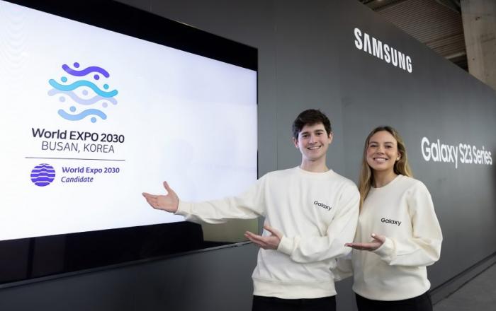 삼성전자가 ‘MWC 2023’이 개최중인 피라 그란 비아(Fira Gran Via)의 갤럭시 전시 부스에서 ‘2030 부산엑스포’ 응원메시지를 담은 홍보 영상을 상영하며 박람회 유치 활동을 알리고 있다. 삼성전자가 2 월 27 일부터