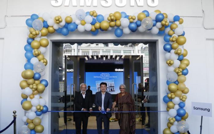 1월 28일 진행된 삼성 익스피리언스 스토어 개장 행사(사진 가운데 박종범 서남아 총괄장)인도 뉴델리 중심가에 신규 개장한 삼성 익스피리언스 스토어 외부 모습인도 뉴델리 중심가에 신규 개장한 삼성 익스피리언스 스토어에 방문한 고객과 제품 설명 중인 매장 직원