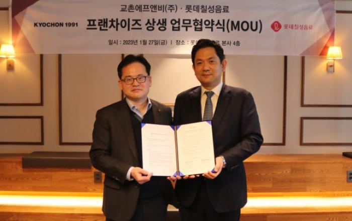 롯데칠성음료가 교촌에프앤비와 공급 계약을 맺고 ‘프랜차이즈 상생 업무 협약식’을 진행했다고 30일 밝혔다.협약식은 27일 서울 송파구에 위치한 롯데칠성음료 본사에서 롯데칠성음료 박윤기 대표이사, 나한채 음료영업본부장, 교촌에프앤비 윤진호 대표이사, 장규식 영업기획실장을