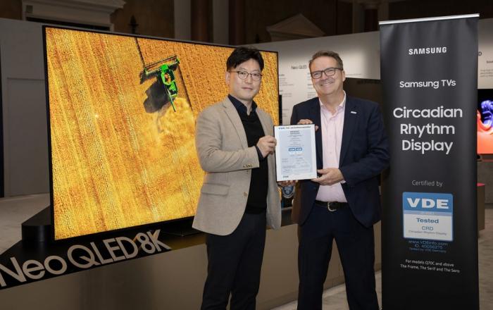 삼성전자 영상디스플레이사업부 용석우 부사장(왼쪽)과 스벤 오케(Sven Öhrke) VDE 마케팅·영업담당 사장이 지난 6일 미국 라스베이거스에서 ‘생체리듬 디스플레이’ 인증서 전달식을 가졌다.삼성전자 2023년형 Neo QLED가 업계 최초로 독일 시험∙인증 전문 기