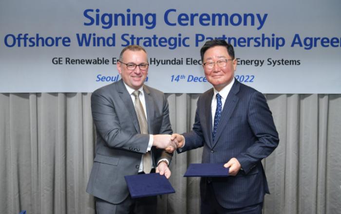 현대중공업그룹의 전력기기 및 에너지 솔루션 계열사인 현대일렉트릭이 미국 GE리뉴어블에너지(GE Renewable Energy)와 손잡고 해상풍력 사업에 나선다. 현대일렉트릭은 14일(수) 서울 반얀트리호텔에서 GE리뉴어블에너지와 ‘해상풍력 시장 진출을 위한 전