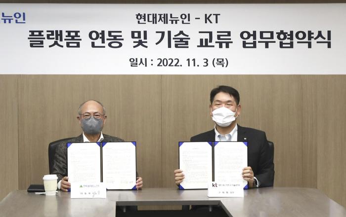 KT가 3일 현대건설기계 분당 사무소에서 현대제뉴인과 ‘상호 플랫폼 연동 및 기술 협력’에 관한 업무협약(MOU)을 체결했다고 4일 밝혔다. 양사는 이번 협약을 통해 건설기계 위치 정보를 활용한 통신 시설물 안정성 강화와 플랫폼 협력을 통한 공동 프로젝