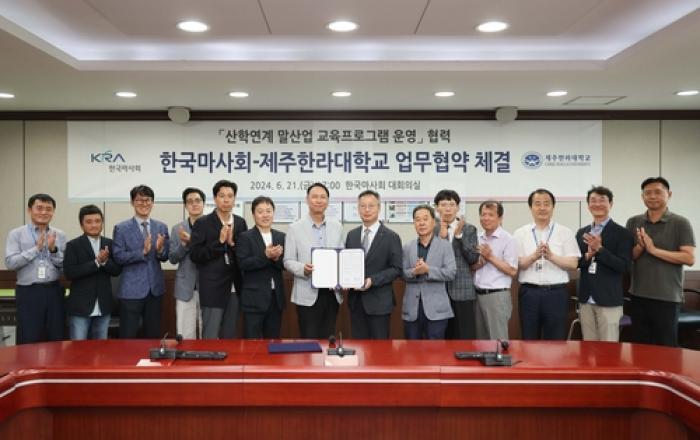 한국마사회는 지난 21일 렛츠런파크 서울에서 제주한라대학교와 '산학연계 말산업 교육프로그램 업무협약'을 체결했다고 밝혔다. 기수교육과정 민간이양의 원활한 안착을 도모하고자 마련된 이번 협약식에는 마사회 송대영 경마본부장, 유병돈 경마관리처장, 한라대 김병선 생명자원