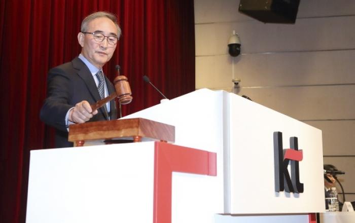 KT가 28일 서울 서초구 태봉로 KT연구개발센터에서 제42기 정기 주주총회를 개최했다. 이날 주주총회에서 ▲제42기 재무제표 승인 ▲정관 일부 변경 ▲이사 보수한도 승인 등 총 3개 의안을 상정해 원안대로 의결했다. KT 김영섭 대표는 의