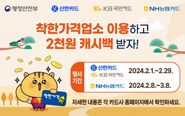 착한가격업소에서 신한·KB국민·NH농협 카드로 1만 원 이상 결제하면 2000원을 환급 받는다. 행정안전부는 민족 최대의 명절인 설을 맞아 민생경제 안정과 소상공인 지원을 위해 카드사와 연계해 추진 중인 ‘착한가격업소 이용 활성화 행사’를 확대 진행한다고 밝혔다.