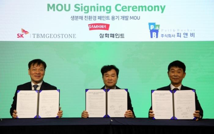 삼화페인트공업㈜은 1월 22일(월) SKC의 생분해 라이멕스 소재 사업 투자사인 SK티비엠지오스톤㈜(SK TBMGEOSTONE)과 원형 플라스틱 제조 업체 ㈜피앤비와 함께 '생분해 친환경 페인트 용기 개발 업무협약'을 체결했다. 체결식은 서울특별시 종로구에 위치한