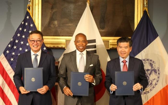 DX전문기업 LG CNS는 미국 뉴욕시청사에서 뉴욕시(NYC)·암참과 DX 파트너십을 위한 양해각서(MOU)를 체결했다. 에릭 애덤스(Eric Adams) 뉴욕시장, 현신균 LG CNS 대표이사, 제임스 김 주한미국상공회의소(AMCHAM, 이하 암참) 회장 겸 대표이사