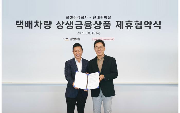 현대커머셜이 로젠 주식회사(이하 로젠)와 함께 택배 차주들을 위한 상생금융 지원에 나선다. 현대커머셜은 로젠과 18일 서울 여의도 현대커머셜 본사에서 ‘택배차량 상생금융상품 제휴 협약’을 체결했다고 이날 밝혔다. 협약식에는 장병식 현대커머셜 대표이사와 김