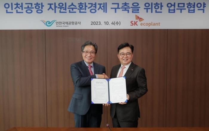 인천국제공항공사는 4일 오전 공사 회의실에서 SK에코플랜트와 '인천공항 자원순환경제 구축을 위한 업무협약(MOU)'을 체결했다고 밝혔다. 이날 협약식에는 인천국제공항공사 이학재 사장 및 전형욱 인프라본부장, SK에코플랜트 박경일 대표이사 및 권지훈 국내 ECO BU