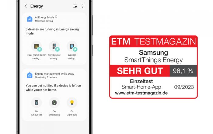 삼성전자의 에너지 관리 서비스인 ‘스마트싱스 에너지’가 독일 베를린에서 열린 IFA 2023에 앞서 현지 유력 매체인 ETM으로부터 차별화된 솔루션으로 인정 받았다. 독일 제품 평가 전문 매체인 ETM은 스마트싱스 에너지의 앱 사용성, 기능·성능, 구성 등을 평가