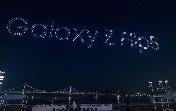 삼성전자가 갤럭시 신제품을 체험할 수 있는 갤럭시 스튜디오 ‘ 부산 광안리’ 오픈을 기념해, 28일 부산 수영구 광안리해수욕장에서 ‘ 드론 라이트쇼(Drone Light Show)’를 진행했다. 이날 밤 8시부터 약 15분간 진행된 라