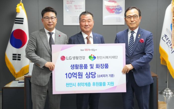 LG생활건강은 충남 천안의 취약계층 지원을 위해 10억 원 상당의 생활용품과 화장품을 1일 천안시복지재단에 전달했다. 이번에 기부한 물품은 샴푸, 바디워시, 세탁세제, 주방용품, 화장품 등 총 47종으로 천안 지역의 사회복지기관단체를 통해 독거 노인과 청