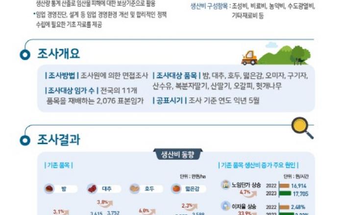 산림청은 밤, 대추 등 주요 임산물 11개 품목에 대해 2023년도 생산비용을 조사한 결과 전년 대비 2∼6%가량 증가하였으며, 단위면적당 소득률(평가액(생산량×단가) 대비 소득 비율)은 호두가 가장 높은 것으로 나타났다고 28일 밝혔다. 2023