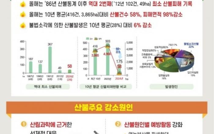 산림청은 2024년 봄철 산불조심기간(2.1~5.15) 운영 결과 올해 5월 15일 기준 산불피해는 175건, 58ha 발생했다고 17일 밝혔다. 올해 산불은 1986년 산불통계 작성 이후 역대 2번째(첫번째 2012년 102건 49ha)