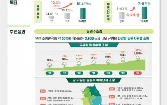 산림청 생태계 보호에 주요한 역할을 담당하는 꿀벌을 보호하고 양봉산업 육성 및 지원을 위하여 우수 밀원자원을 중심으로 밀원숲을 조성해 나갈 계획이라고 20일 밝혔다. 현재 우리나라 사육봉군 밀도는 세계 1위로 양봉가구수와 봉군수, 사육규모