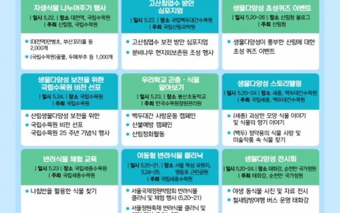 산림청 국립수목원과 경기도는 2024년 ‘세계 생물다양성의 날’을 기념하여 오는 5월 22일에 우리 자생식물 나눔행사와 어린왕자 프로젝트 등의 행사를 국립수목원에서 진행한다. 세계 생물다양성의 날은 유엔(UN)이 생물다양성의 보전과 관련된