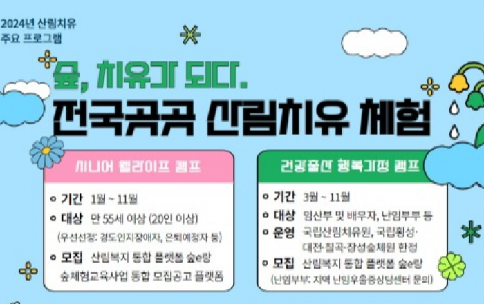 산림청은 국민들이 숲을 통해 건강한 삶을 누릴 수 있도록전국 치유의 숲에서 산림치유프로그램을 운영한다고 8일 밝혔다. ‘치유의 숲’은 산림을 활용하여 인체의 면역력을 높이고 건강을 증진할 수 있도록 조성된 숲이다. 지난 2007년 경기 양평군