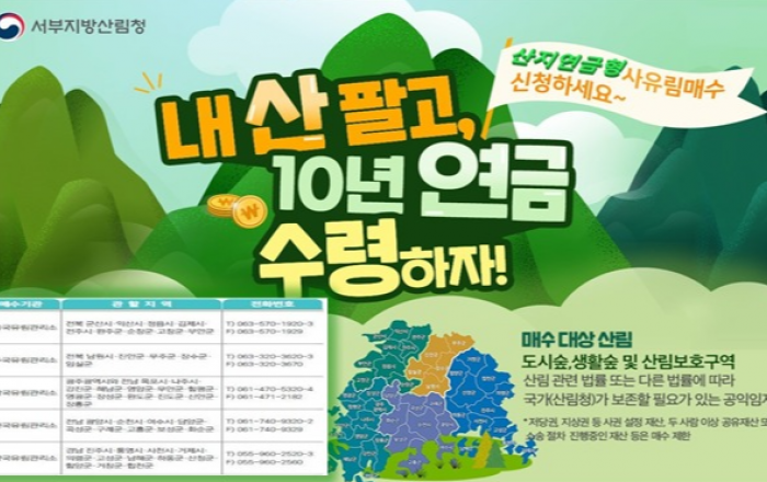 서부지방산림청은 지난 2021년 처음 도입하여 시행 중인 ‘산지연금형 사유림 매수제도’를 올해는 매수물량 163ha(예산 17억) 확보하여 본격적으로 추진 중이라고 밝혔다. 산지연금형 사유림 매수제도는 매매대금(감정평가액)을 일시에 지급하는 기존 일시지급