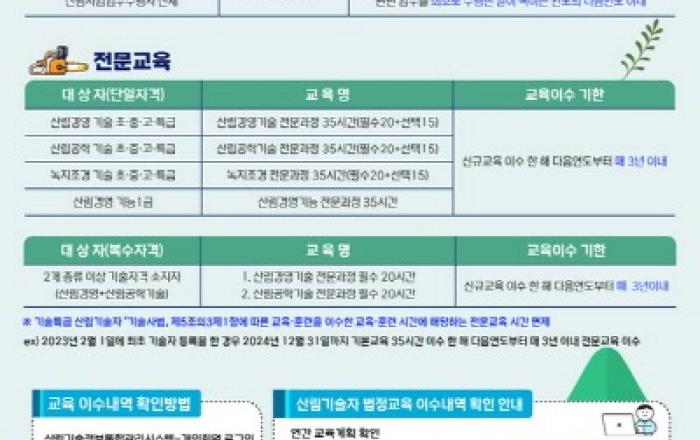 산림청은 산림기술자의 교육·훈련 이수 시기 완화 및 행정절차를 간소화하기 위해 ‘산림기술 진흥 및 관리에 관한 법률(이하 산림기술법) 시행규칙’ 일부를 개정했다고 21일 밝혔다. 기존에 산림기술자 법정의무교육은 신규교육자인 경우 최초 업무