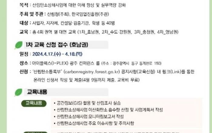 산림청과 한국임업진흥원은 ‘산림탄소상쇄사업 역량강화 교육’을 오는 4월부터 9월까지 전국 4개 권역에서 순차적으로 실시한다고 25일 밝혔다. 산림탄소상쇄사업이란 산주, 기업, 지방자치단체 등이 자발적으로 산림을 통해 탄소흡수원 유지 및 증