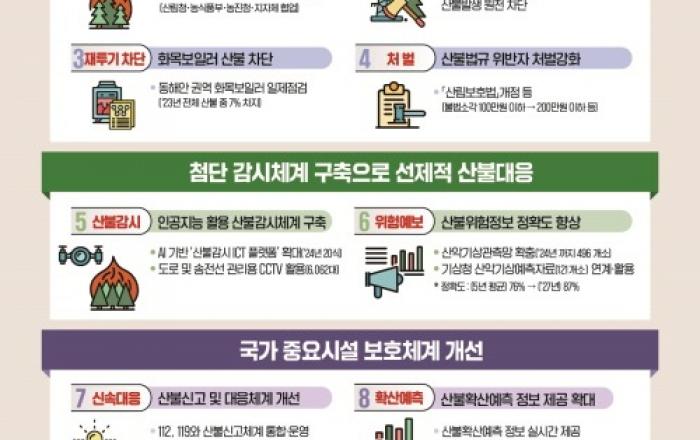 산림청은 점점 일상화·대형화되고 있는 산림재난(산불, 산사태, 산림병해충)에 선제적으로 대응하기 위하여 범부처 협업 등을 골자로 하는 ‘산림분야 국민안전 강화방안’을 마련했다고 밝혔다. ‘산림분야 국민안전 강화방안’은 27일 국무총리 주재 제35회 국정현안관계장관회의에