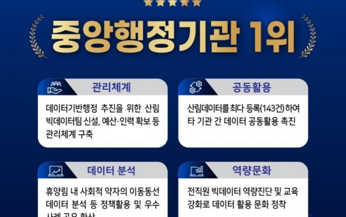 산림청은 중앙행정기관, 지방자치단체, 공공기관 등 467개 기관을 대상으로 실시한 2023년 ‘데이터기반행정 실태점검 평가’에서 45개 중앙행정기관 중 1위 달성이라는 영예를 차지했다고 밝혔다. 특히, 데이터 관리체계, 공동활용, 역량문화